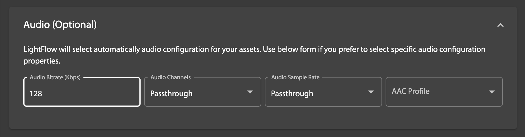 In the optional Audio section you can specify any of the following parameters, which will override LightFlow's automatic settings: