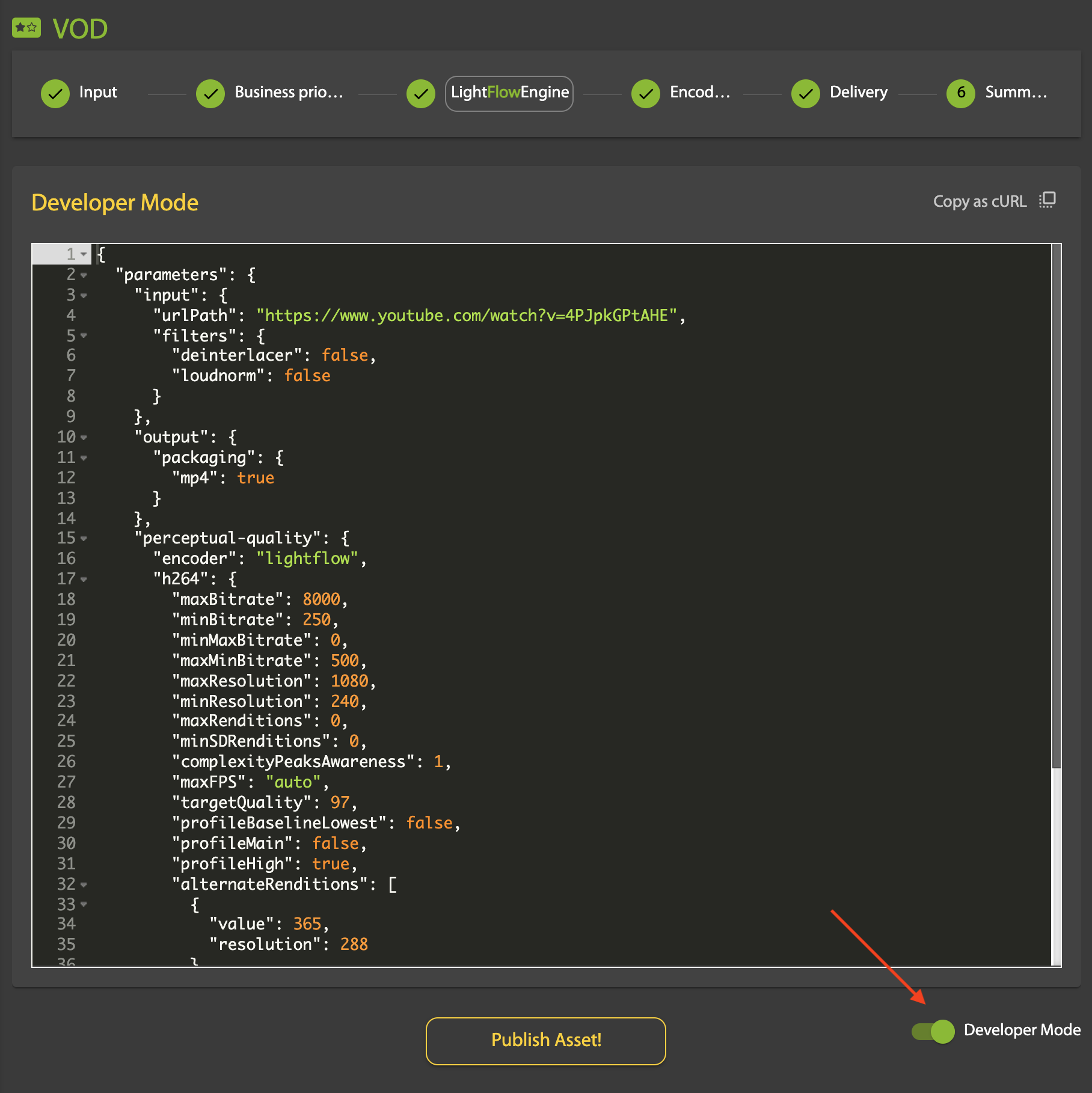 The asset creation parameters you define in the portal can be displayed (and modified) in JSON format in Developer Mode: