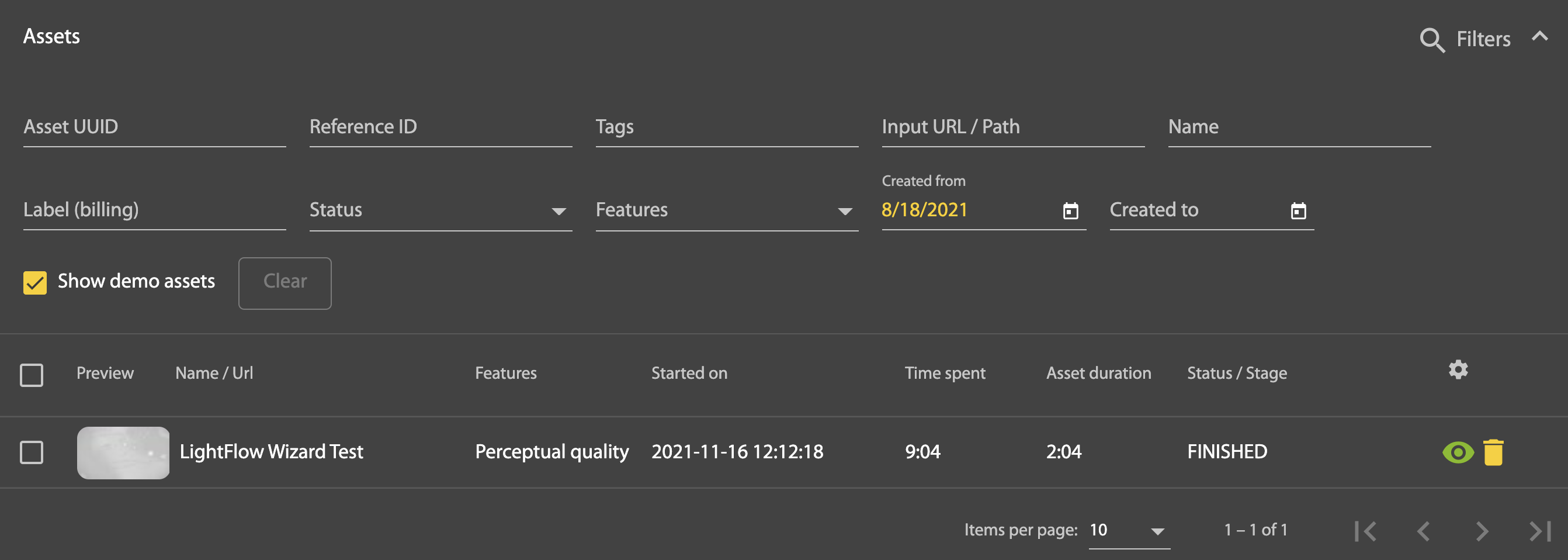 You can filter the list of video assets to identify specific videos or conditions (your settings will persist until you change them, or click Clear):