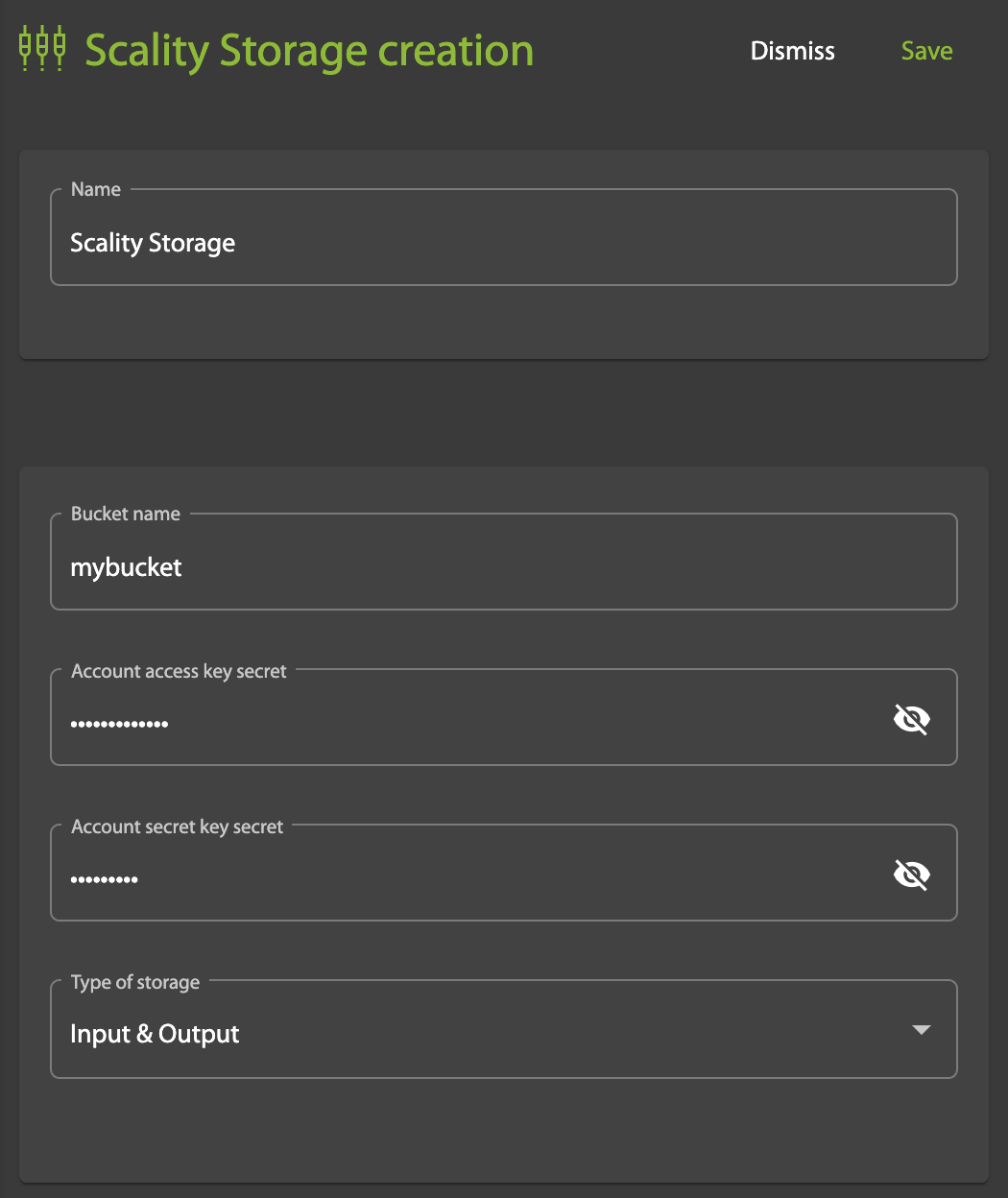 - Type of storage: Select Input, Output or Input & Output (the same bucket can be selected for input and also as a repository for the output files)