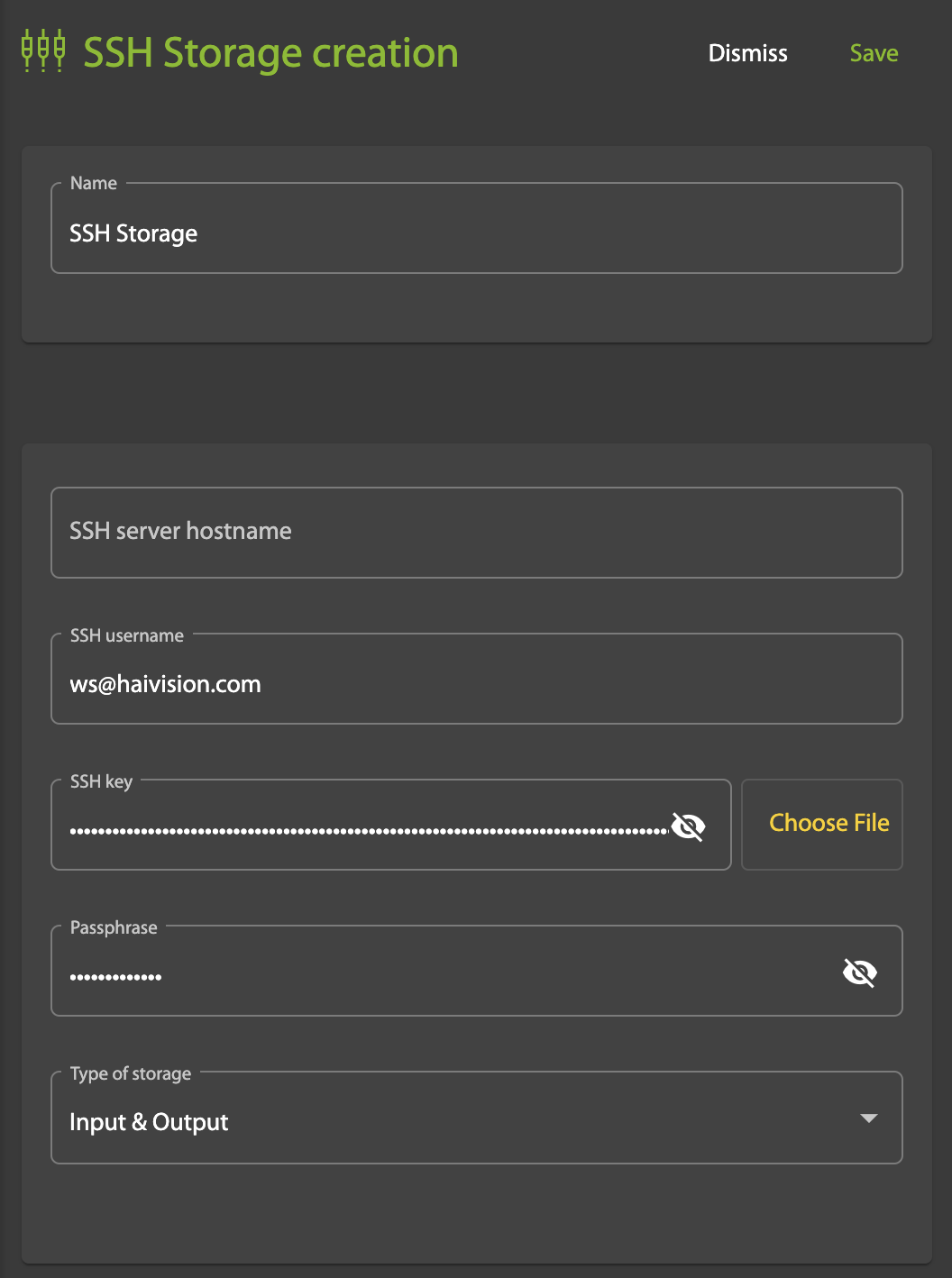 On the SSH Storage Creation page that appears, enter the following information: