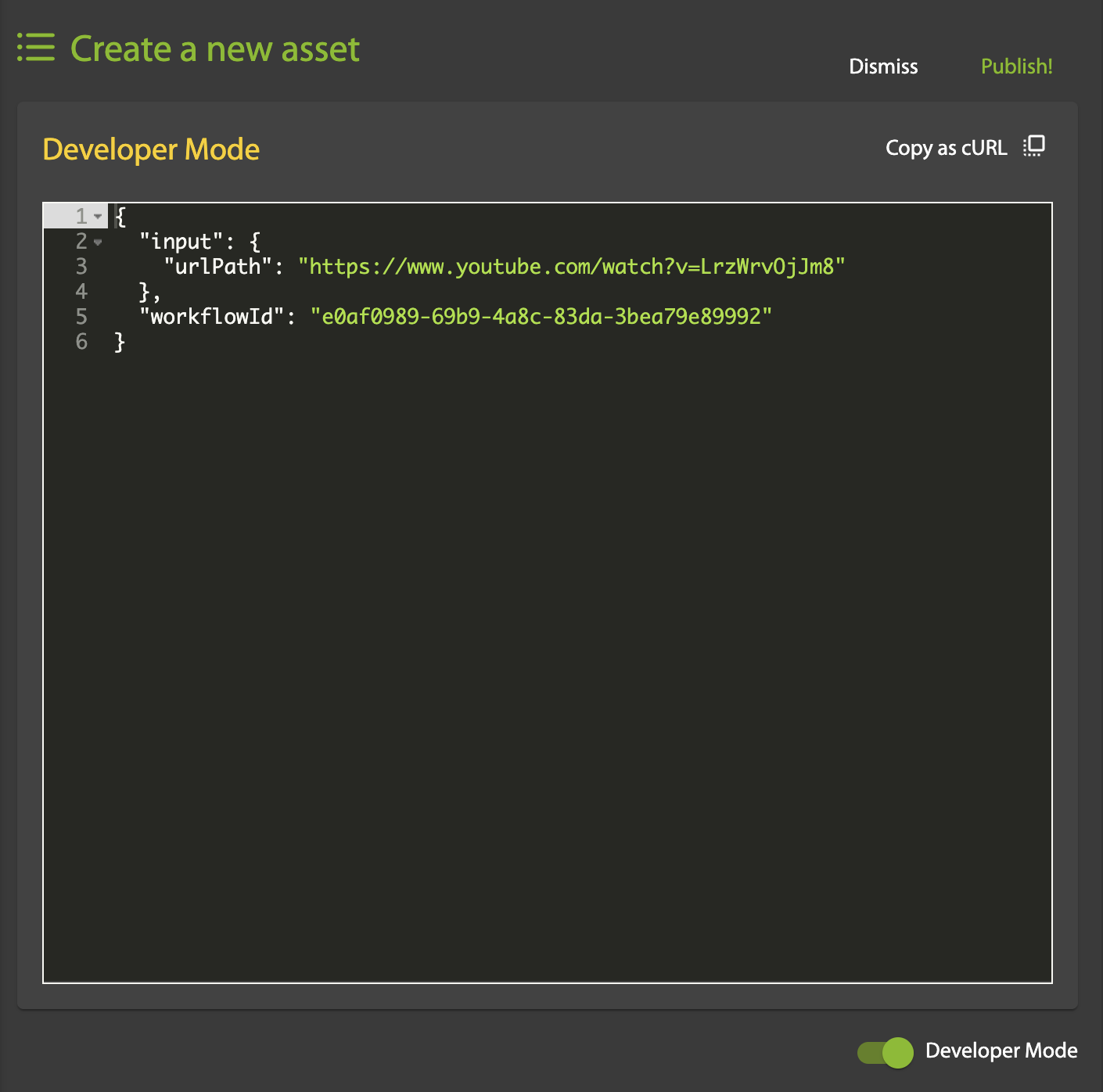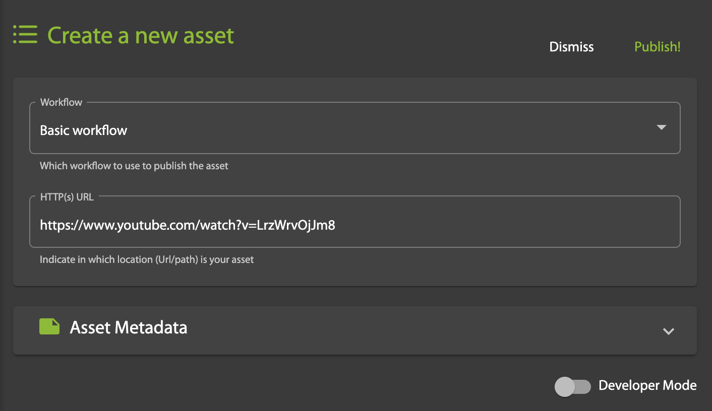On the Create a new asset page, select the Workflow to be applied, enter the Input path (URL) of the source video, then click Publish! to activate the workflow.