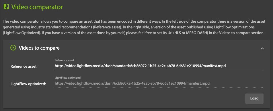 if you select LightFlow as the output, the Reference asset under Videos to compare is automatically filled in. To compare LightFlow with other encoding profiles that you are using, you can edit the Reference asset. Specify a manifest generated by you, as long as it is at an accessible URL. This will allow you to make a fair comparison of whatever you had published in the past against LightFlow's optimizations.