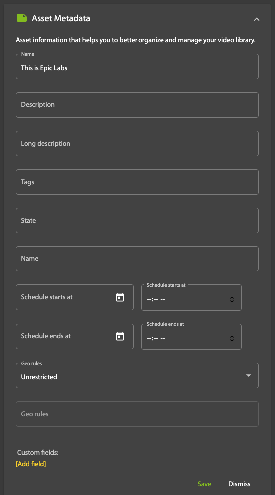 Click Add field under Custom fields to attach a new key-value pair to the asset's metadata.