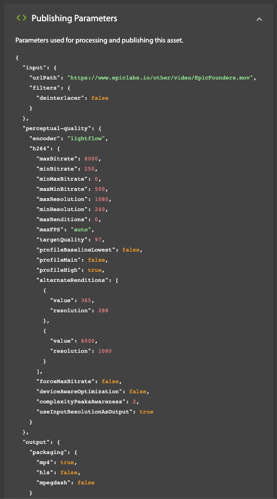 The playback URLs for your video are based on the publishing parameters. If the configured output is LightFlow, the host name and the paths where the videos are located are used to construct the playback URLs.