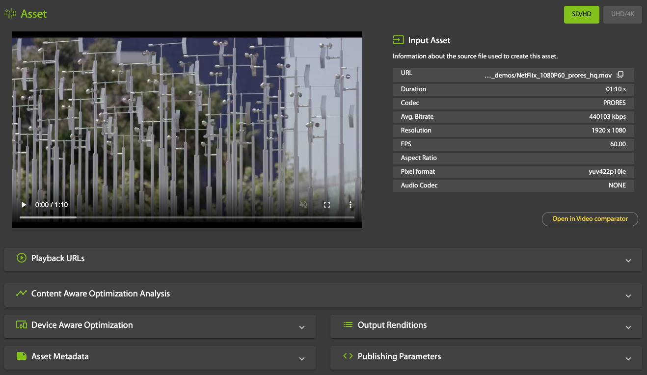 In the menu that appears, the first option (View asset) is available in every case. The second option (Video comparator) is available only if the output was produced using the LightFlow encoder.