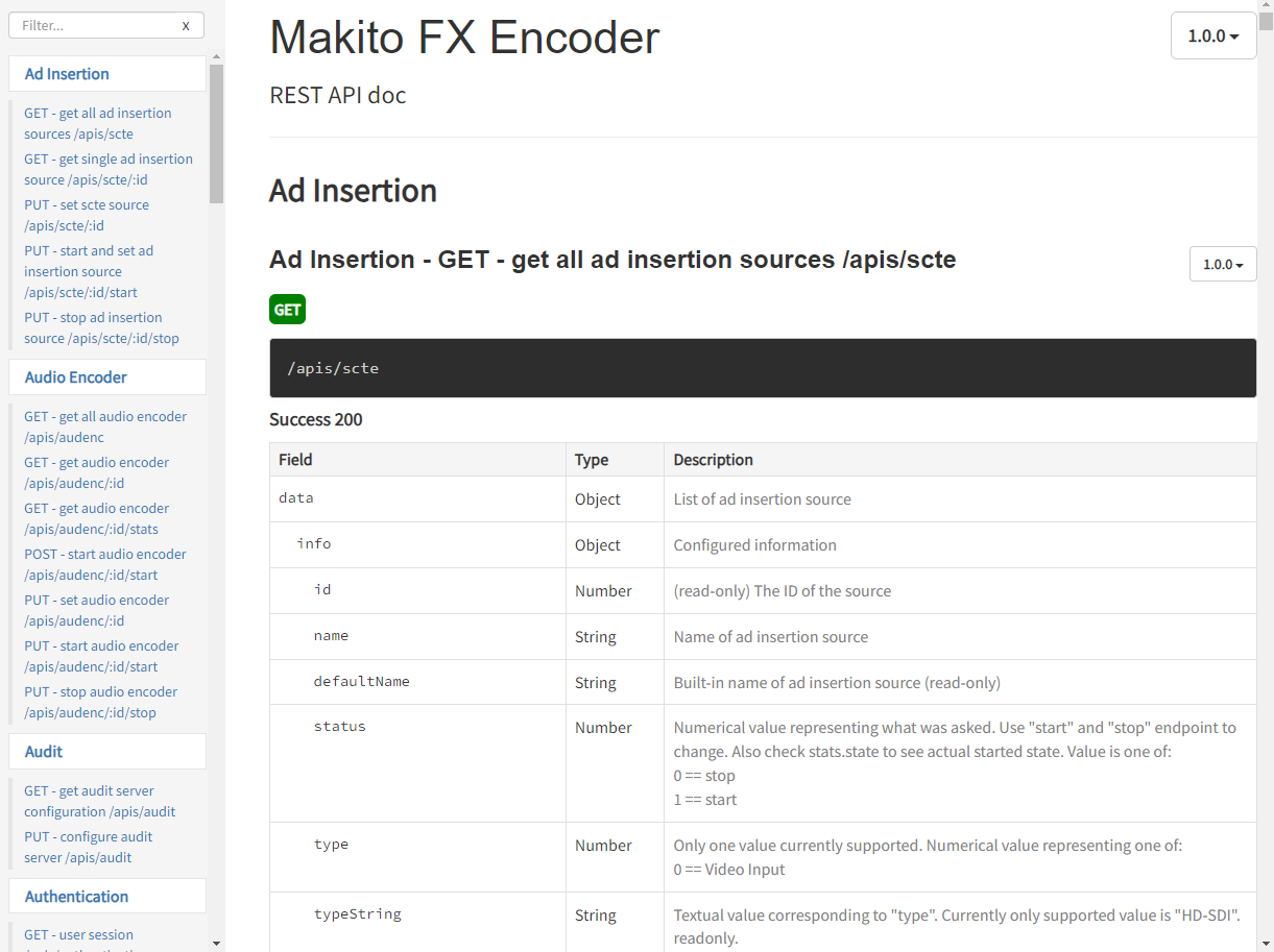 The Makito FX encoder Application Programming Interface (API) is a modern Representational State Transfer (REST) API stack that provides all functionality from the Makito FX Web Interface and is harmonized with other Haivision appliances.