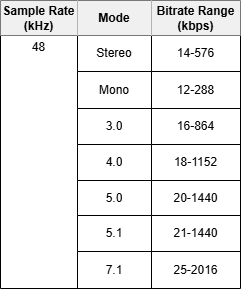 | 128 kbps | The Audio Bitrate for the encoder. Overall range: 4...2016 Note The available bitrate range depends on the current |
