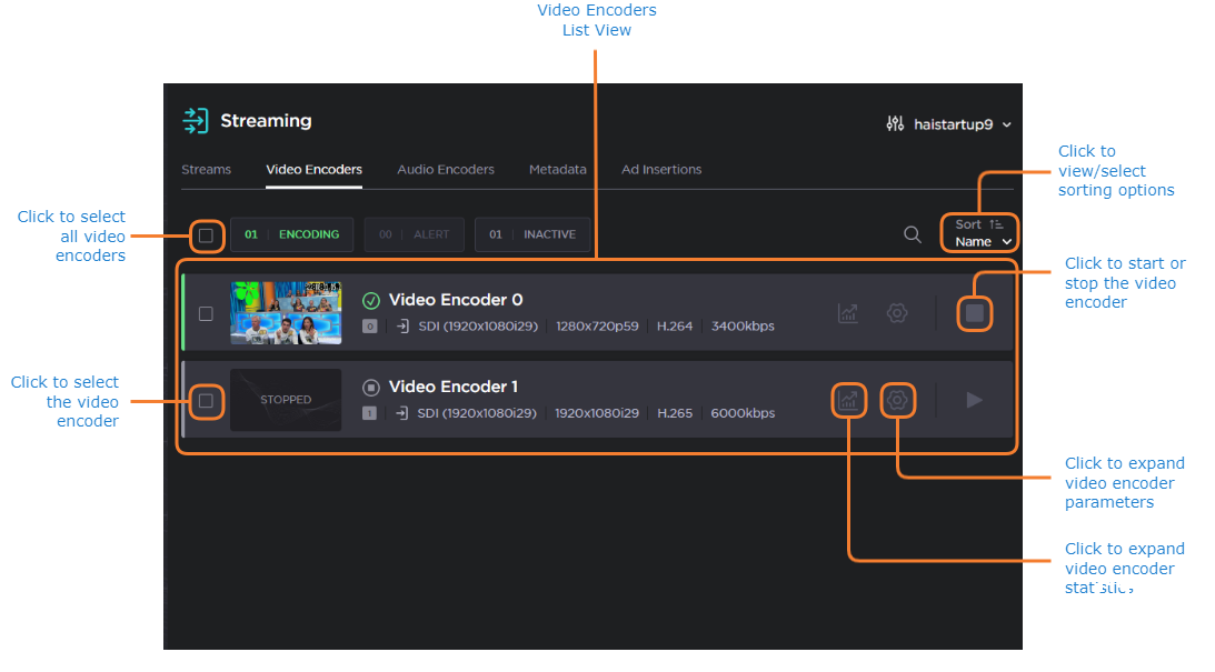 The Video Encoders List View displays information at a glance for the video encoders, as shown in the following example:Click the Sort dropdown menu to view the sorting options. The video encoder list view can be sorted in Ascending or Descending order, or by: