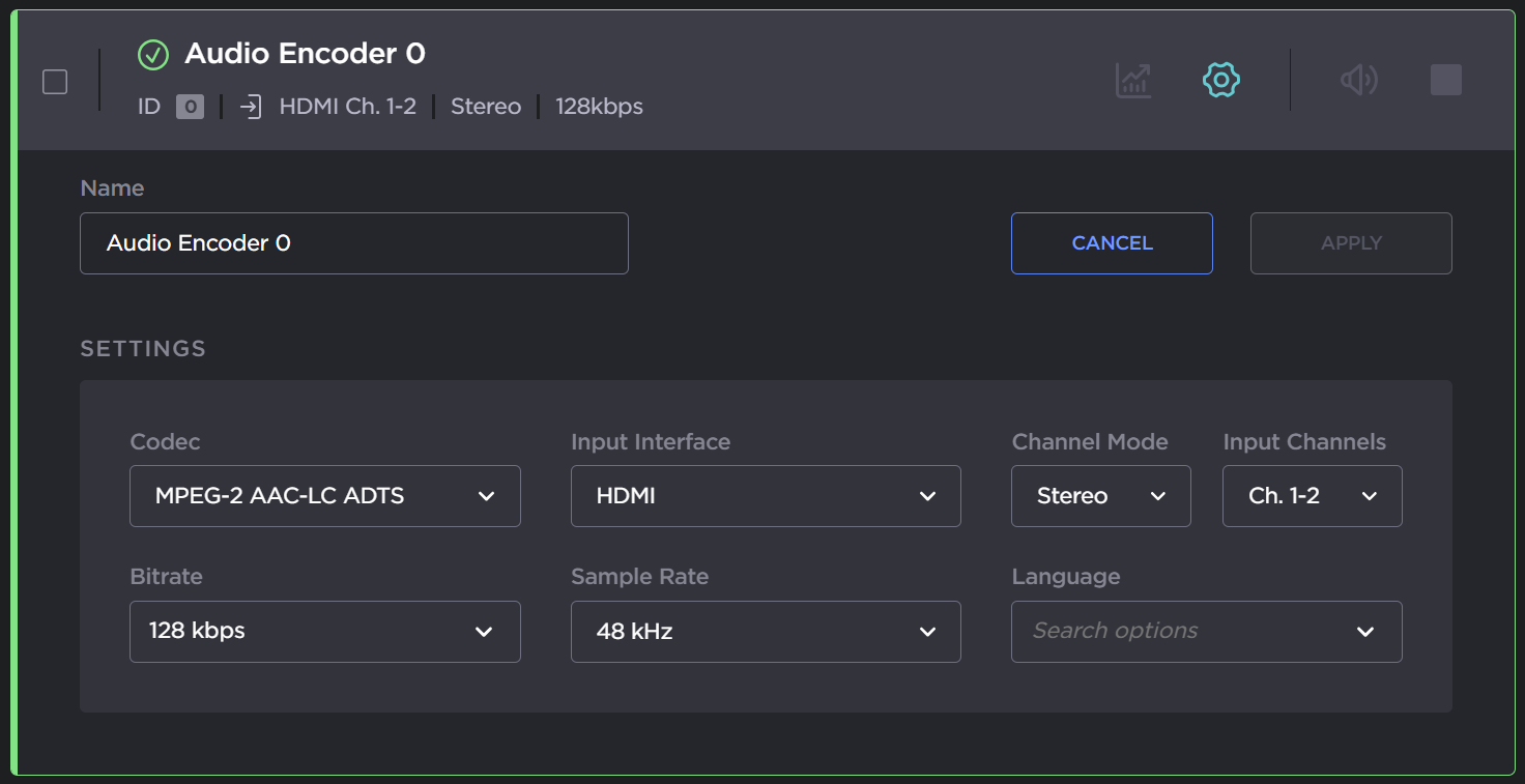 From the Audio Encoders List View, click the Settings icon in the audio encoder panel you wish to modify. The Audio Encoder Detail View opens, displaying the current audio settings for the selected encoder.