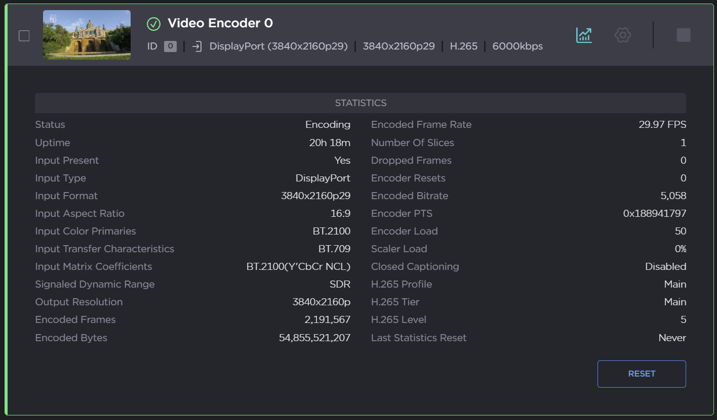 From the Video Encoder Detail View, you can define the Input interface and video encoding parameters, such as the Codec Algorithm, Encoding Profile, Bitrate, Frame Rate, and GOP Size.