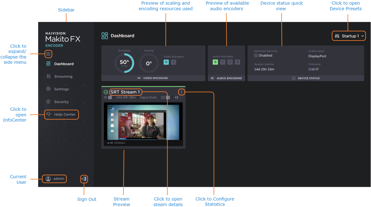 Select Help Center from the sidebar to access online Help. You will be re-directed to the Haivision InfoCenter website, which contains the MFX documentation. See How to use the InfoCenter for tips and tricks for browsing the site.