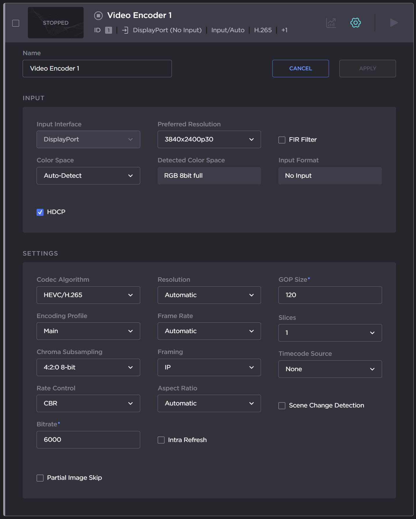 From the Video Encoders List View, click the Settings icon on the encoder panel. The Video Encoder Detail View opens, displaying the settings for the selected video encoder.