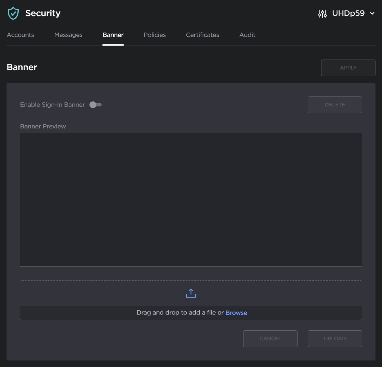 From the Banner page, administrators can upload a text file for the Advisory and Consent Banner. The banner is typically an advisory/warning notice to be displayed before the Sign-in page.