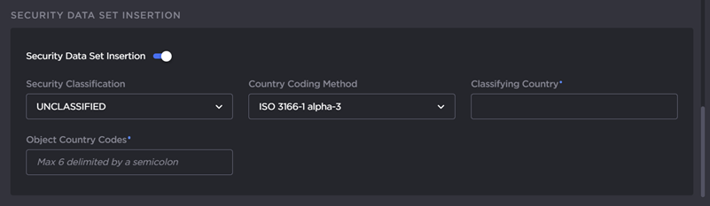 When this feature is enabled, you then specify the classification (Unclassified, Restricted, Confidential, Secret, or Top Secret), the classifying country, and the object country/ies (up to 6) (using the proper ISO 3-letter country code).