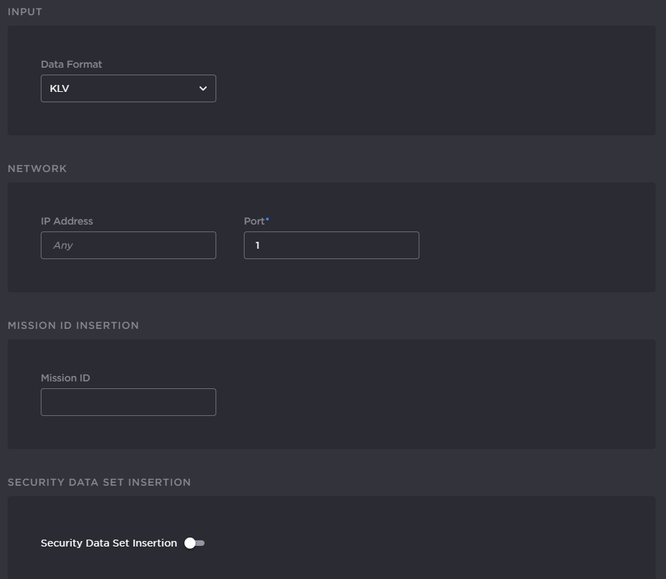 Configure the following Input, Network, Mission ID Insertion and Security Data Set Insertion sections.