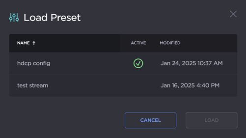 The Load Preset panel opens. Select the preset configuration from the list and click Load.