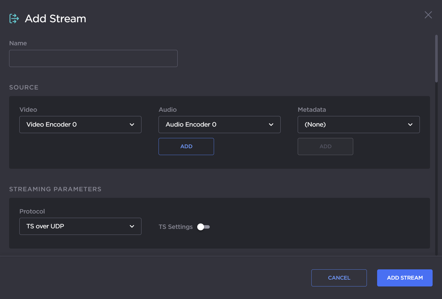 In the Streams tab, click the Add Stream button to create the first stream.