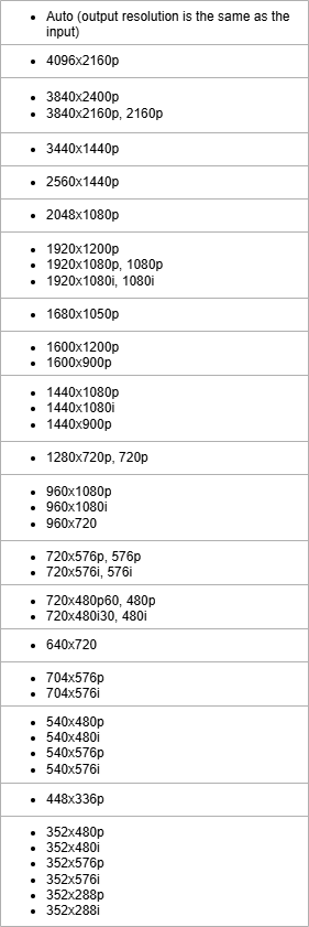 | Auto | Specifies the stream output resolution (i.e., the number of lines per frame and pixels per line to be encoded). Options depend on the Input Format detected. |