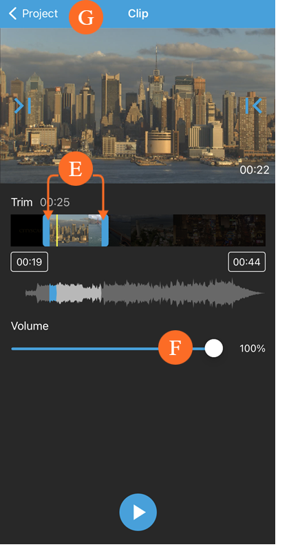 On the Clip screen, you can adjust the start and stop points of the video and adjust the audio volume.