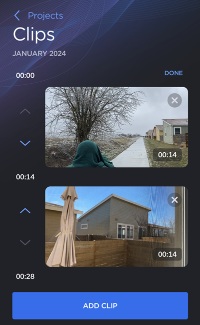 Tap a thumbnail to trim the clip or adjust its volume. See Trimming Clips for more information.