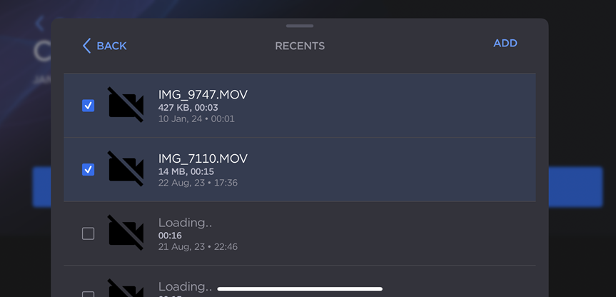 Tap a filename to preview a clip. The most recently previewed file is indicated by a white icon on the thumbnail, as shown in the example below:
