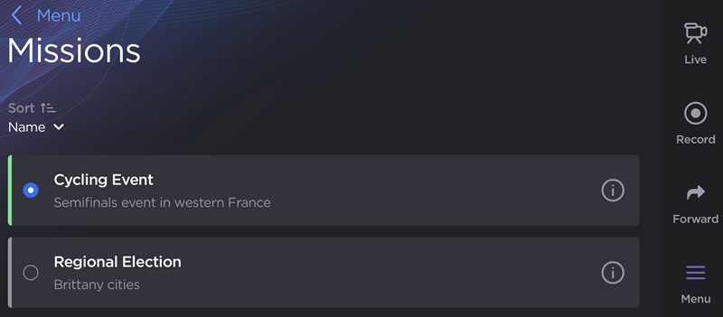 When connected to a Manager configured to support a Story-Centric Workflow, MoJoPro can be assigned missions. Missions consist of .XML or .JSON files containing data pushed from NRCS (News Room Computer System) or PAM (Program Asset Management) systems. When a MoJoPro user selects a mission, live streams and forwarded files are transmitted to the connected receiver with mission metadata. For information on creating missions and managing Story-Centric Workflows, please refer to the Manager User Guide.