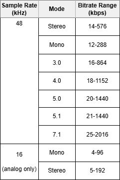 bitrate | 128 kbps | The Audio Bitrate for the encoder. Overall range: 4...2016 Note The available bitrate range depends on the current |