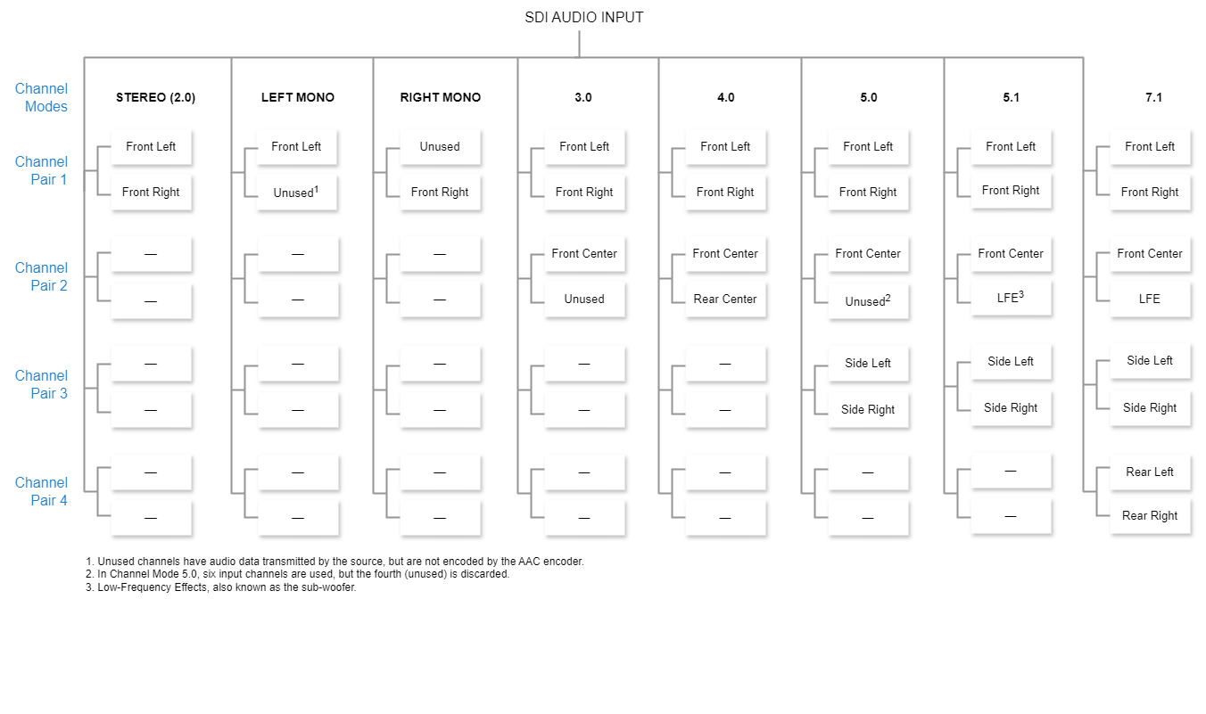 Channel Mode | Stereo | GeneralThe Channel Mode determines the audio channel layout (both the layout expected from the SDI input, and the layout expected upon output on the decoder end), and the number of audio channels required to process the audio input.