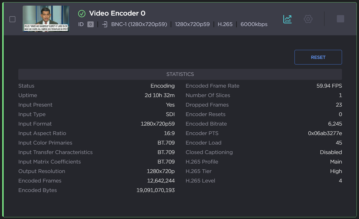 To view the statistics for the encoder, click the Statistics icon . For details, see Video Encoder Statistics.