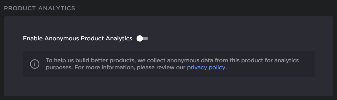 To enable or disable the collection of anonymous product analytics, toggle Enable Anonymous Product Analytics on or off.