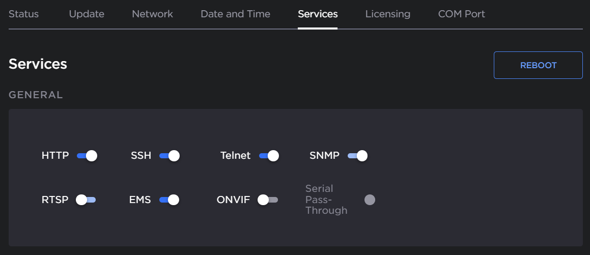 For security purposes, an administrator may need to stop one or more network services from accessing the Makito X1. From the Services page, you can enable and disable network services, including HTTP, SSH, Telnet, SNMP, RTSP, ONVIF, Haivision EMS, and Product Analytics. You can also enable bi-directional serial pass-through for controlling serially attached devices such as PTZ controlled cameras. Both RS-232 and RS422 are supported.