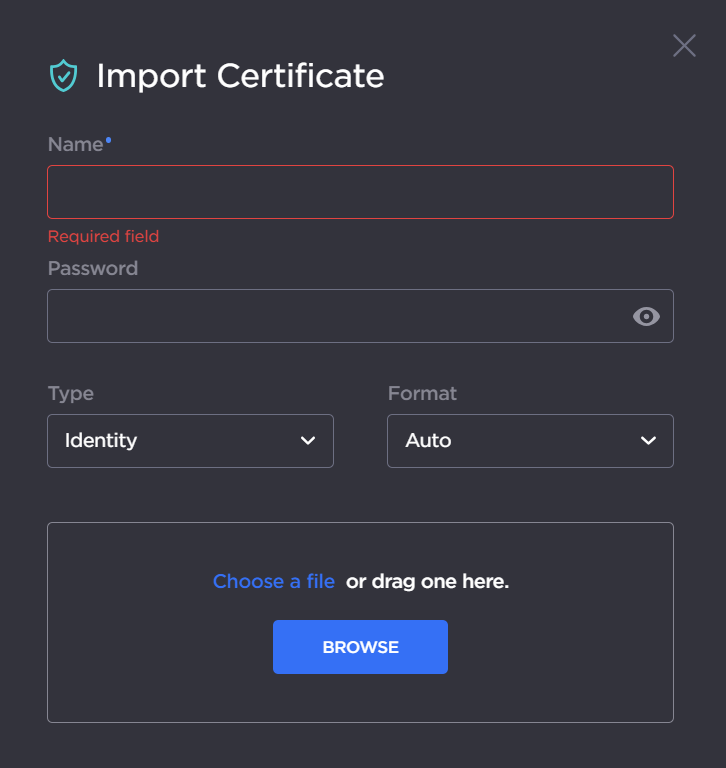 2. On the Import Certificate dialog, type in the Name and complete the remaining fields. See "Import Identity or CA Certificate dialog" in "Certificate Settings" (link below).