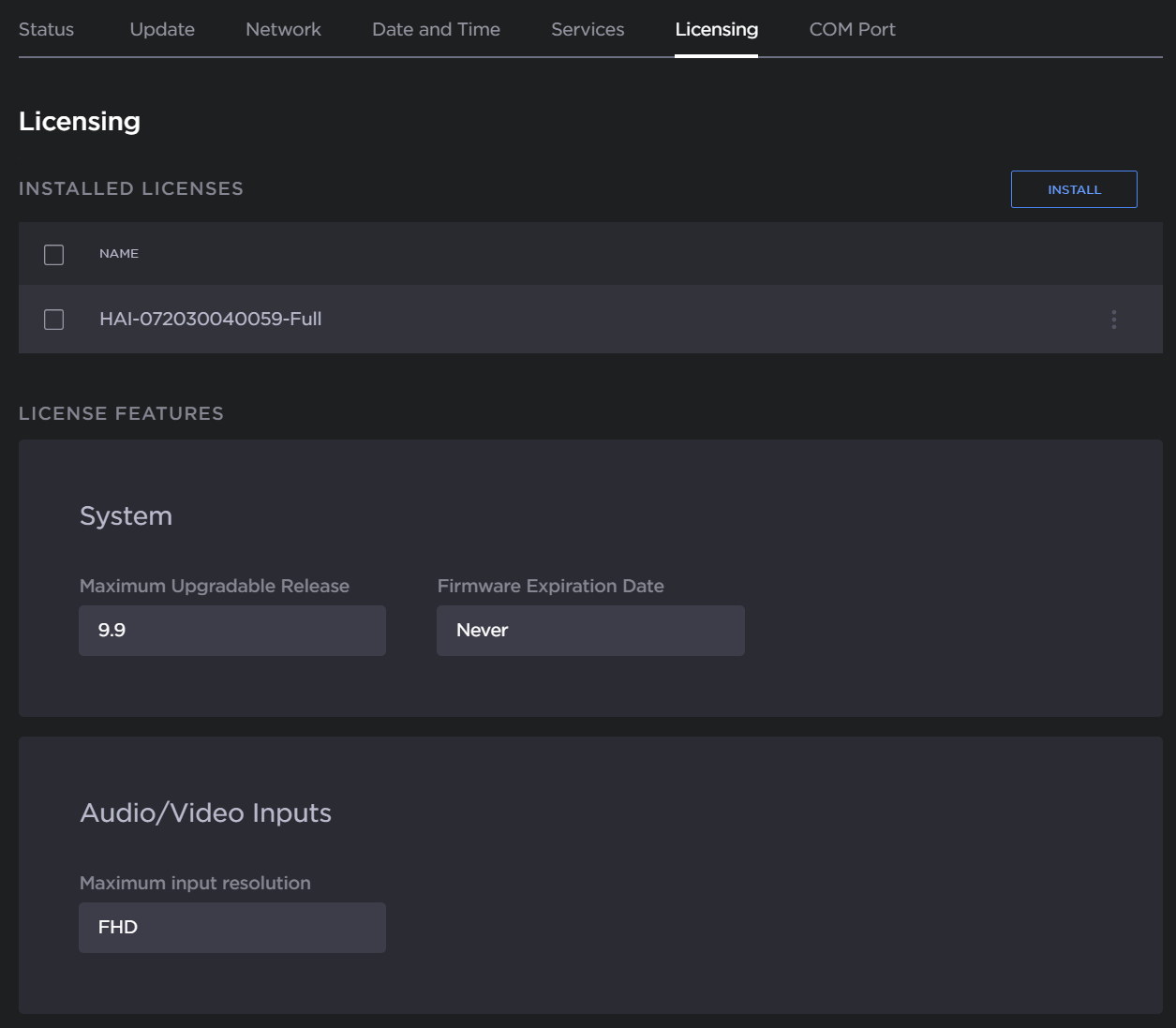 The Licensing page opens, displaying the list of currently installed licenses and the associated features, including:Audio/Video Inputs