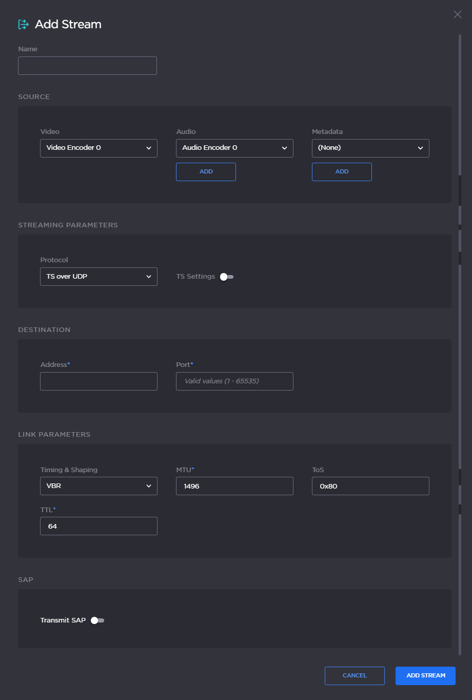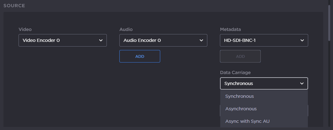 To add metadata to the stream, select the Metadata source, and (optionally) select the encapsulation type (Data Carriage).