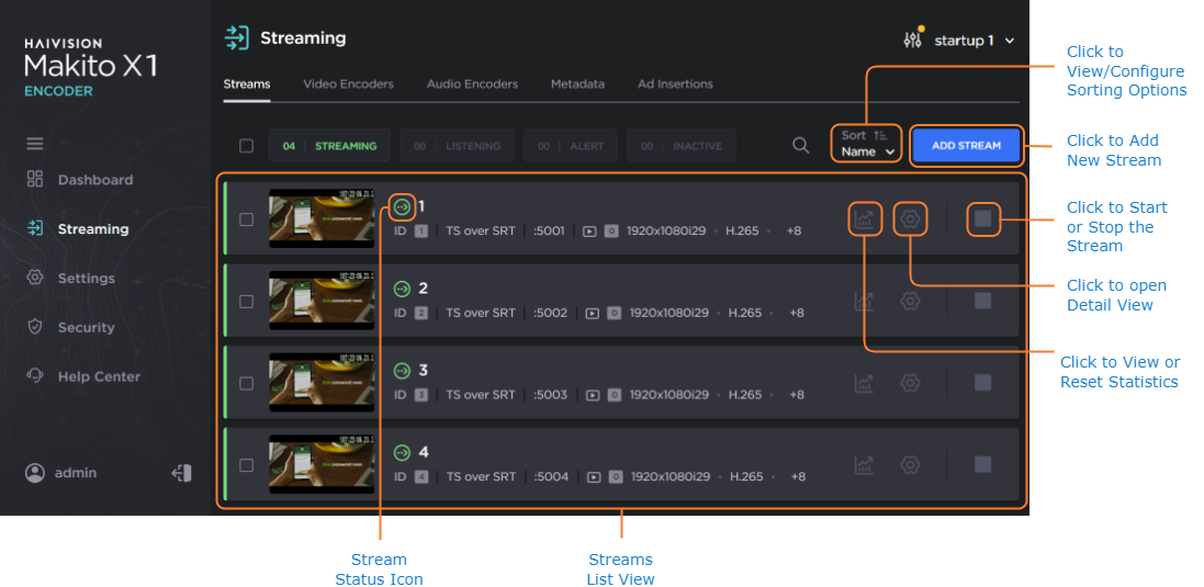 Click Streaming on the sidebar, and select the Streams tab. The Streams List View opens, displaying the list of defined streams for the encoder.