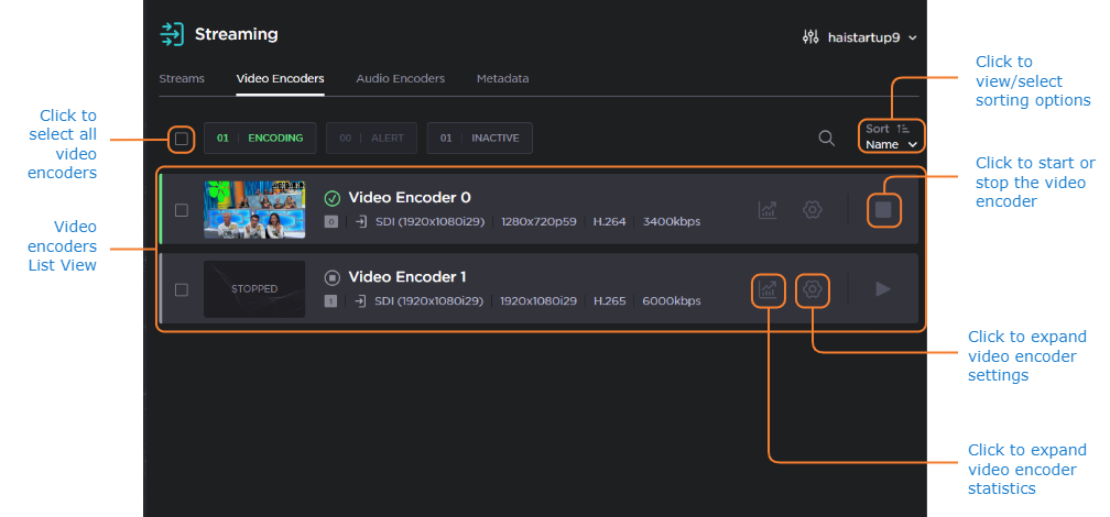 Click Streaming on the sidebar, and select the Video Encoders tab. The Video Encoders List View opens.