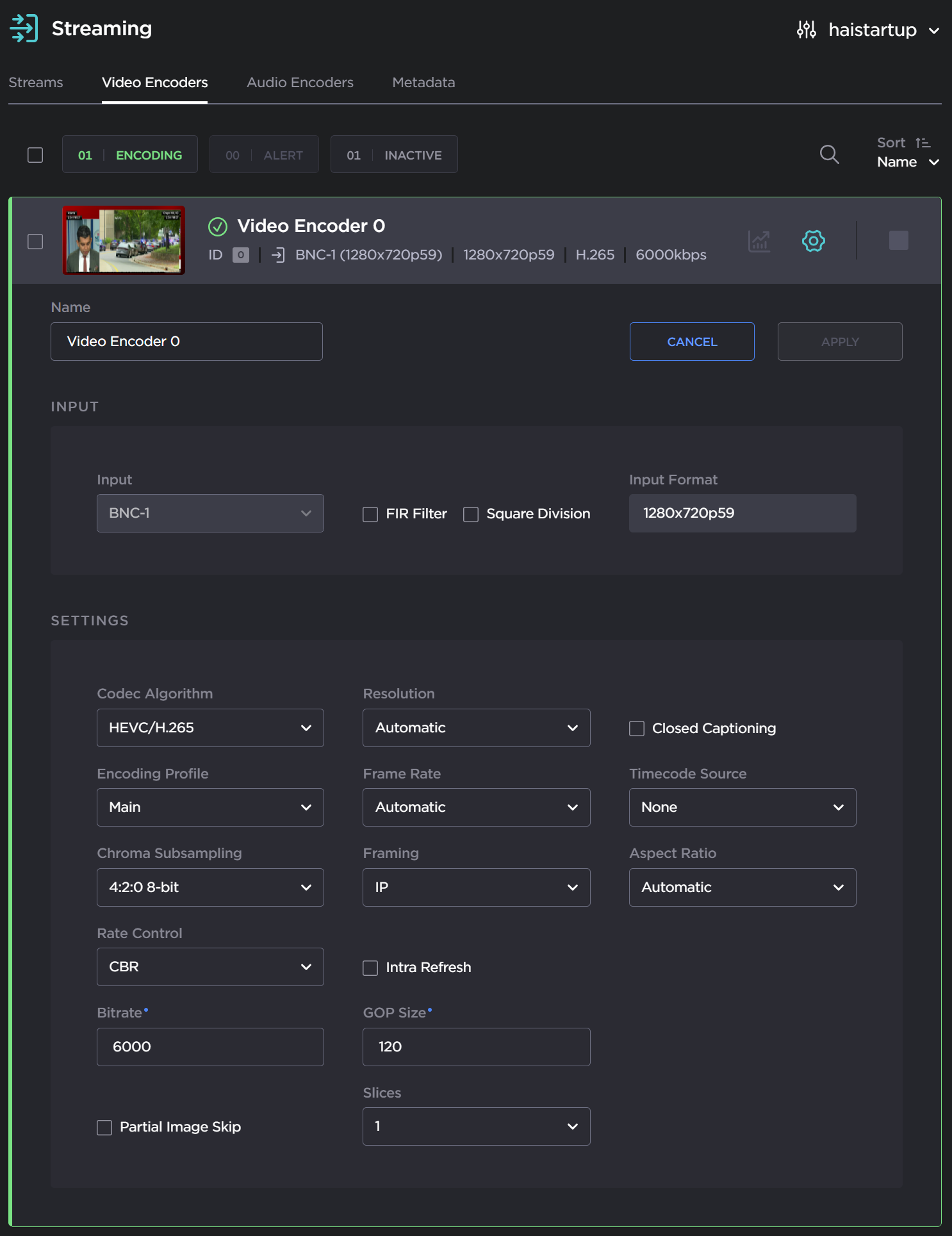Click the Settings icon on the encoder panel to open the Video Encoder Detail View, displaying the settings for the selected video encoder.