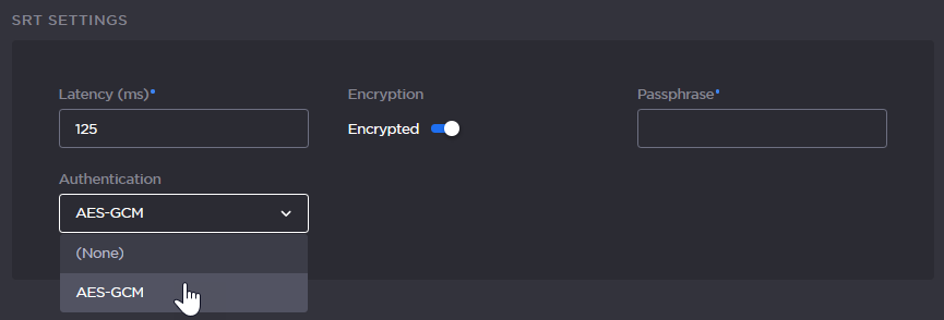 Authentication options in Caller and Rendez-vous modes are None (default) or AES-GCM. Authentication options in Listener mode are Auto (default) or AES-GCM.