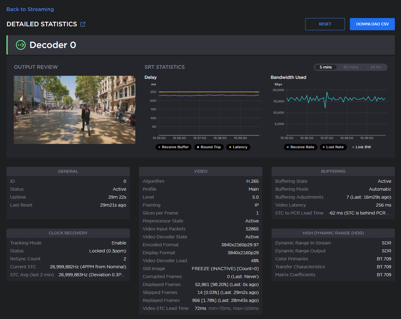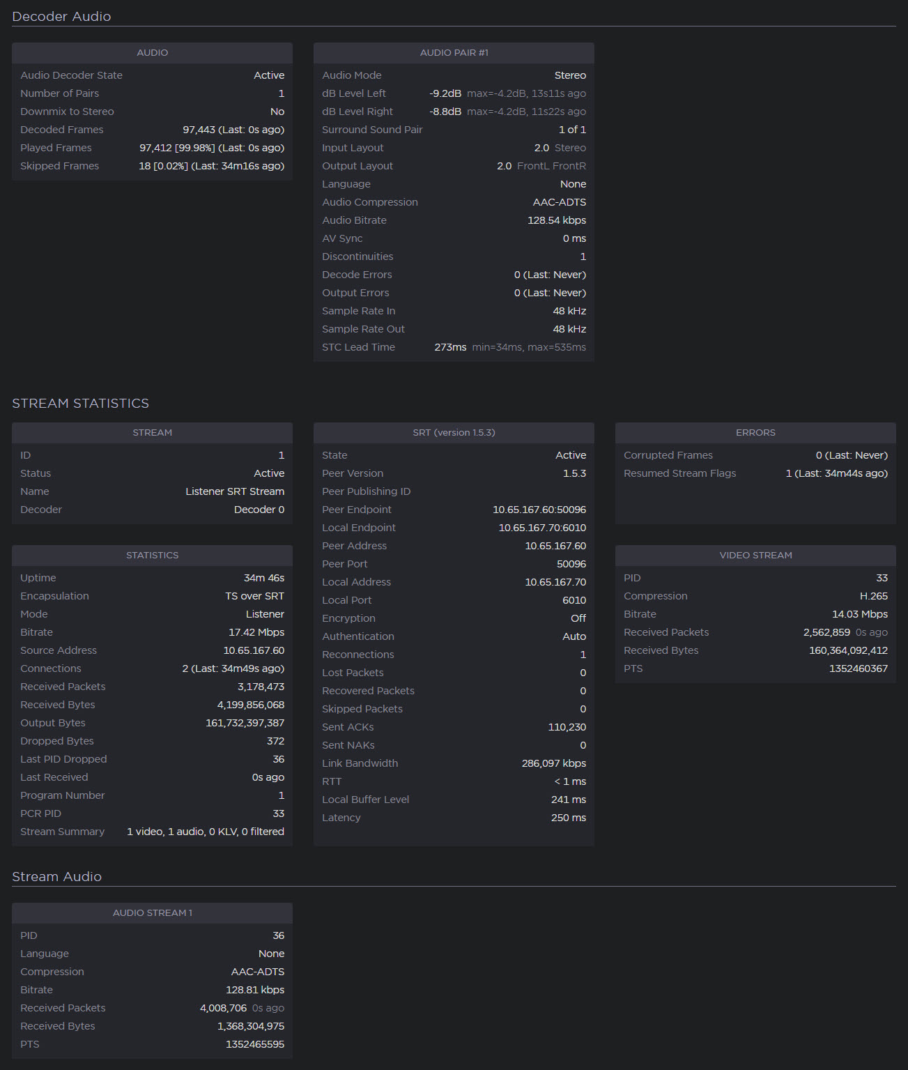 Scroll down to view all statistics, including Decoder Audio, Stream, and Stream Audio statistics.