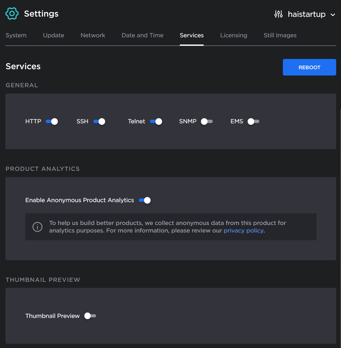 For security purposes, an administrator may need to stop one or more network services from accessing the Makito X4 decoder. From the Services page, you can enable and disable network services, including HTTP, SSH, Telnet, and SNMP. You can also enable or disable Haivision EMS as well as the Control Center Thumbnail Previews.