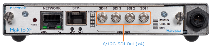 The Makito X4 decoder SDI video interface consists of four 75 Ω HD-BNC connectors.