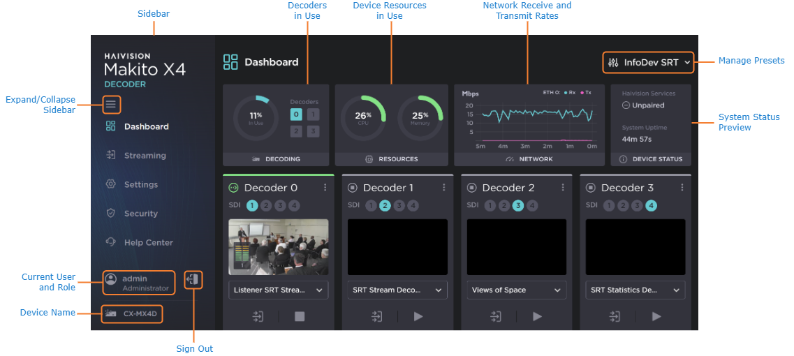The dashboard provides visual references to quickly asses the decoding, resource, and network states. It also displays essential device status information, including: service connection, the unit's serial number, system uptime, and firmware version. For more information, see Navigating the Dashboard.
