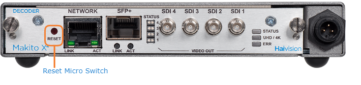 This section describes the steps to perform a hardware reset on the Makito X4 decoder. The Reset button is used either to reset the system or to restore the factory default settings.