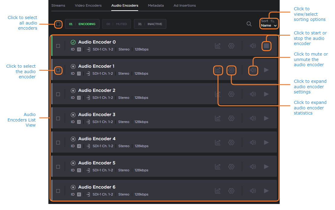 From the Audio Encoders tab, you can configure up to 32 independent audio encoders to apply to streams. You can start, stop, mute, and unmute each audio encoder, as well as display settings and statistics for the encoder.