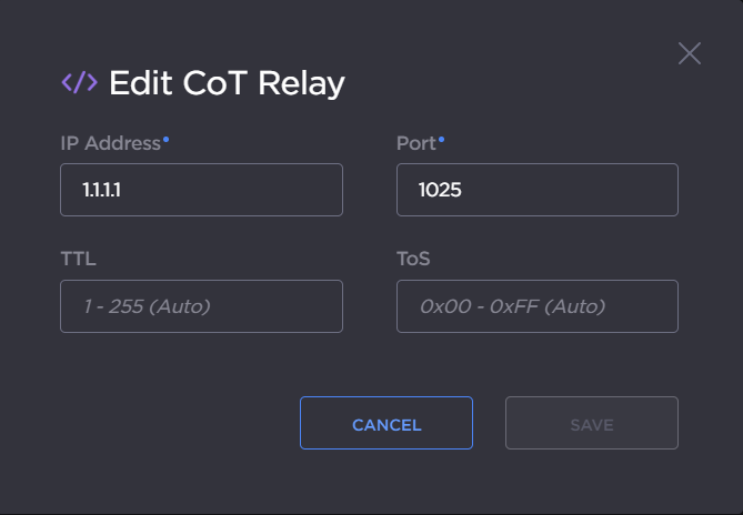 4. On the Add CoT Relay dialog, enter the IP Address and Port for the destination. Adjust the TTL and TOS values if required.