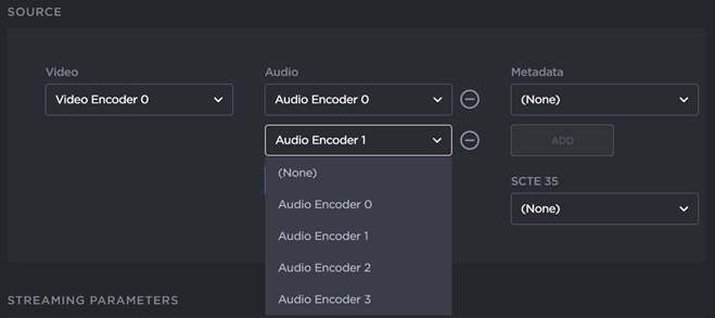 To configure multi-track audio, click the Add button under the Audio field and select the next Audio Encoder to add to the stream. To remove one or more Audio Encoder(s) from the stream, click the Remove icon next to the Audio Encoder field(s).
