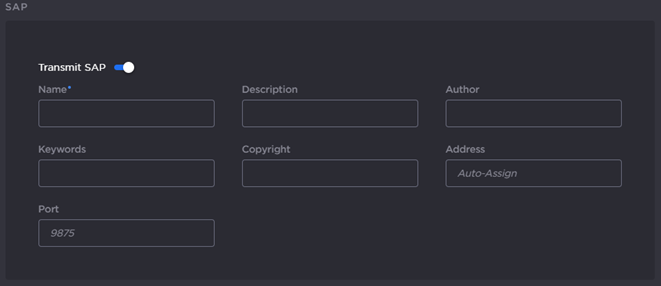 To configure SAP network announcements, toggle Transmit SAP on and fill in the SAP fields. For details, see Session Announcement Protocol (SAP).