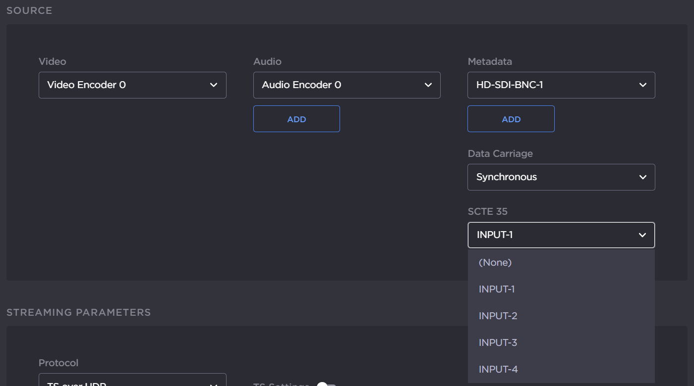 To enable ad insertion, select the appropriate SDI input from the SCTE 35 drop-down menu, as in the following example: