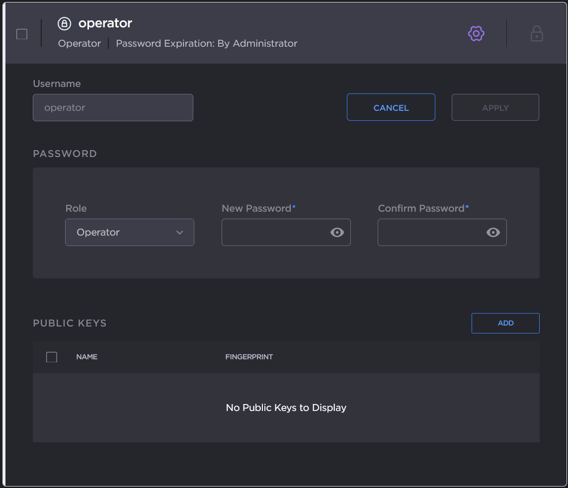 For security purposes, you cannot modify the Name or Role for an existing account.To reset the password of an existing account, type the new password into both the New Password and Confirm Password fields. For the allowed characters, see "Password Requirements" in Changing Your Password.